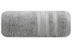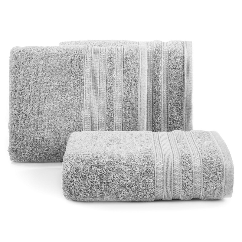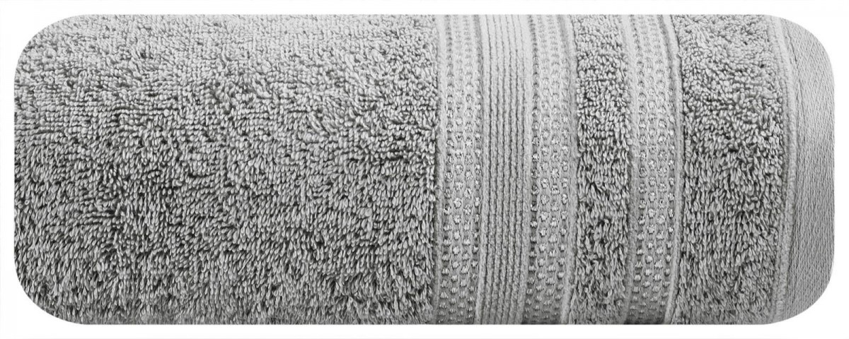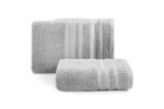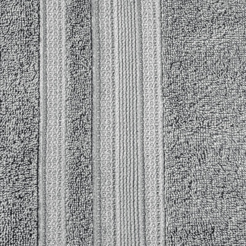 Minimalistyczny ręcznik kąpielowy z chłonnej bawełny frotte. Bordiura zdobiona cienkimi pasami z dodatkiem lśniącej nici. Ręcznik odpornym na częste pranie. , szerokość: 70 cm, długość: 140 cm, kolor SZARY. Gramatura: 500 GSM. Skład: 100% bawełna, 90% bawełna 10% nić metaliczna