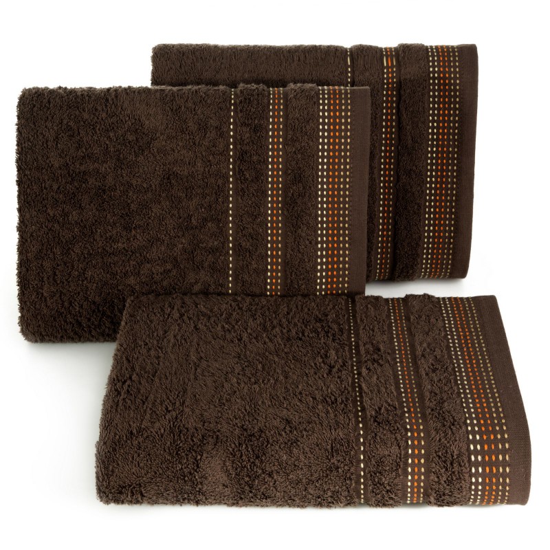 Jednobarwny ręcznik z miękkiej i chłonnej tkaniny bawełnianej o splocie frotte zdobiony kolorową bordiurą w stylu fastrygi. Łatwy w praniu, nie farbuje. , szerokość: 50 cm, długość: 90 cm, kolor BRĄZOWY. Gramatura: 500 GSM. Skład: 100% bawełna
