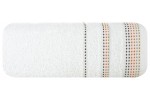 Jednobarwny ręcznik z miękkiej i chłonnej tkaniny bawełnianej o splocie frotte zdobiony kolorową bordiurą w stylu fastrygi. Łatwy w praniu, nie farbuje. , szerokość: 70 cm, długość: 140 cm, kolor BIAŁY. Gramatura: 500 GSM. Skład: 100% bawełna