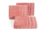 Jednobarwny ręcznik z miękkiej i chłonnej tkaniny bawełnianej o splocie frotte zdobiony kolorową bordiurą w stylu fastrygi. Łatwy w praniu, nie farbuje. , szerokość: 30 cm, długość: 50 cm, kolor KORALOWY. Gramatura: 500 GSM. Skład: 100% bawełna