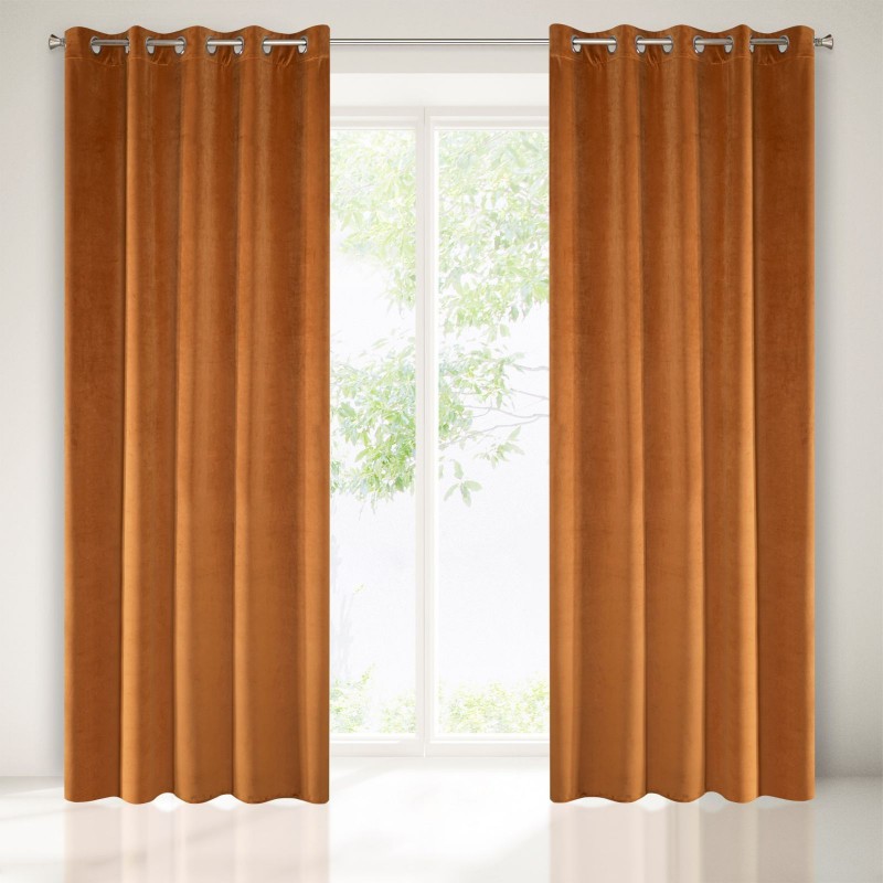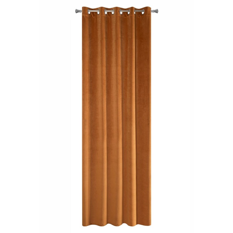 Gładka, jednokolorowa zasłona z miękkiego welwetu o charakterystycznym dla aksamitu połysku. Aż 10 szerokich przelotek umożliwia proste upięcie dekoracji okna. , szerokość: 140 cm, długość: 250 cm, kolor RUDY. Gramatura: 290 GSM. Skład: 100% poliester